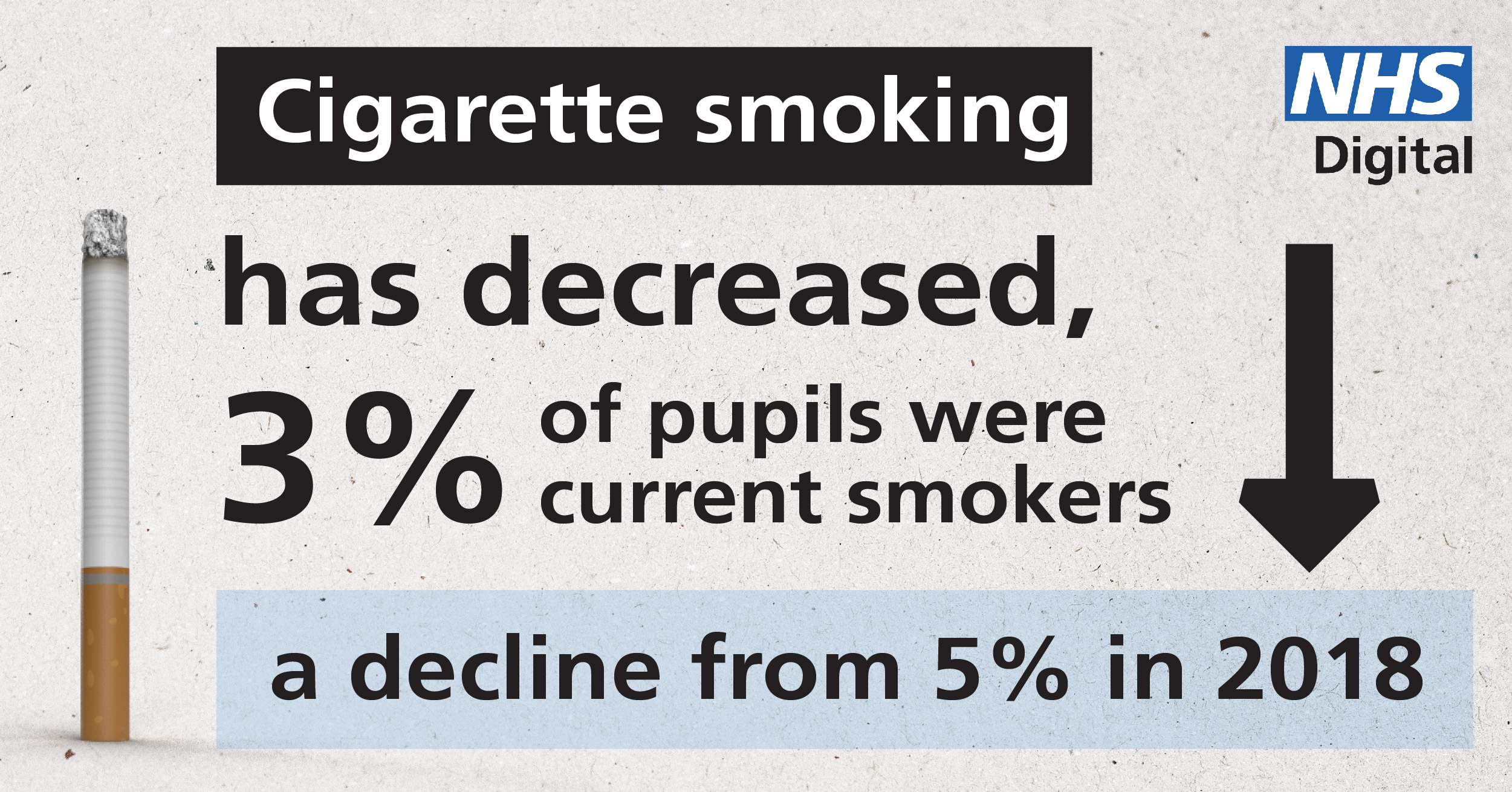 The Smoking, Drinking and Drug Use among Young People in England, 2021 report2 also found that cigarette smoking has decreased, 3% of pupils were current smokers, a decline from 5% in 2018. In addition, 12% reported having ever smoked, a decrease from 16% in 2018, and the lowest level ever recorded.